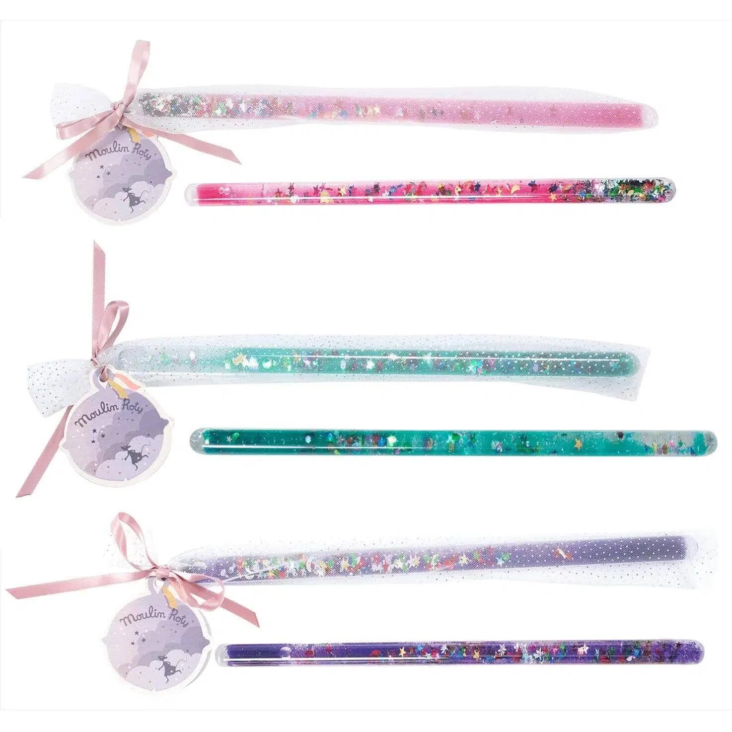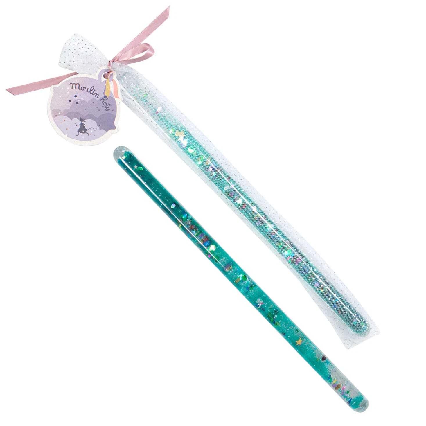 Infilata nel sacchetto di tulle e legata con un nastro di raso, la bacchetta magica di Moulin Roty è composta da un tubo di plastica/acrilico contenente un gel colorato e tantissimi lustrini e oggetti all’interno a forma di palline, stelle, cuori o lune.