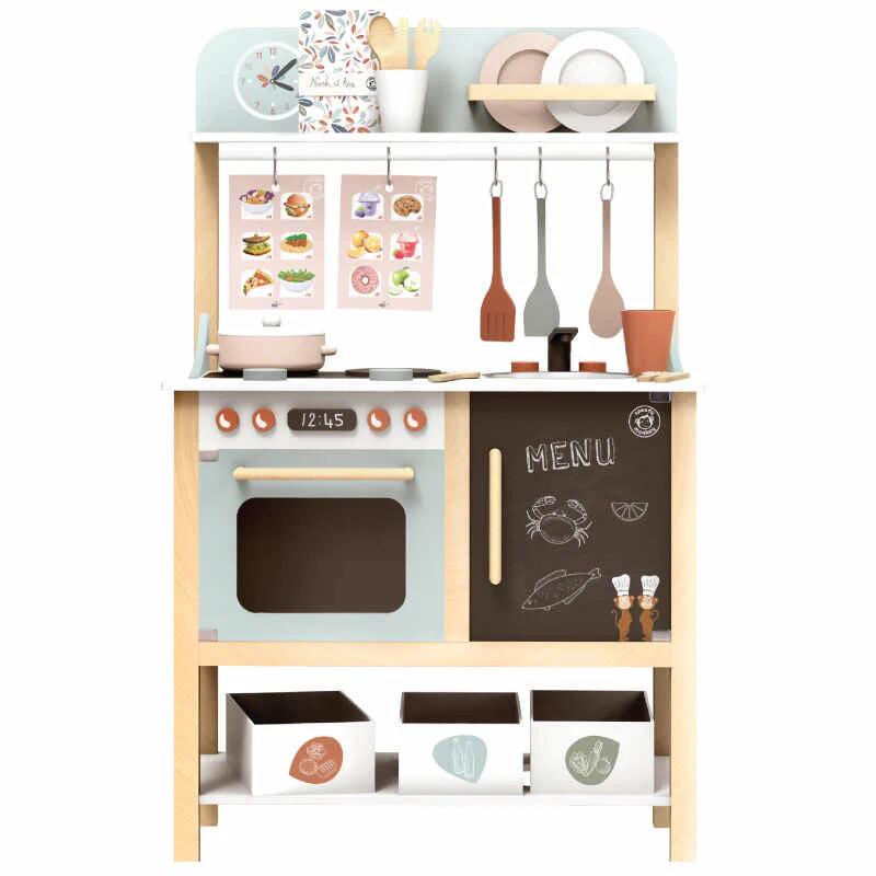Realizzata in legno proveniente da foreste certificate FSC®, questa cucina garantisce sicurezza e rispetto per l’ambiente. I materiali di alta qualità e le finiture atossiche la rendono ideale per bambini dai 3 anni in su (anche due anni).