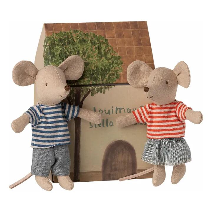 LouiMax e sua sorella Stella sono topolini in formato Little Brothers & Sisters che si adattano perfettamente alla casa mobile per topi SuitCasa. Vengono forniti in una scatola ancora più piccola a forma di casa.