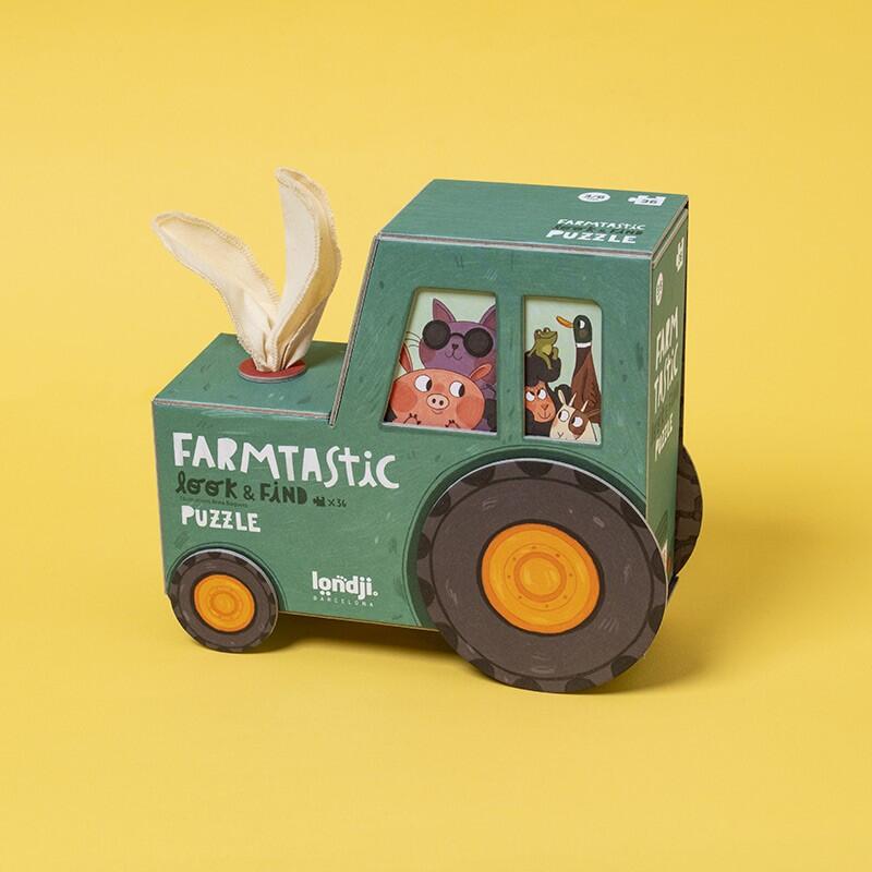 Un puzzle da 36 pezzi con animali da fattoria e una scatola a forma di trattore, che include un gioco di osservazione da 40 carte per guardare, cercare, immaginare e divertirsi!