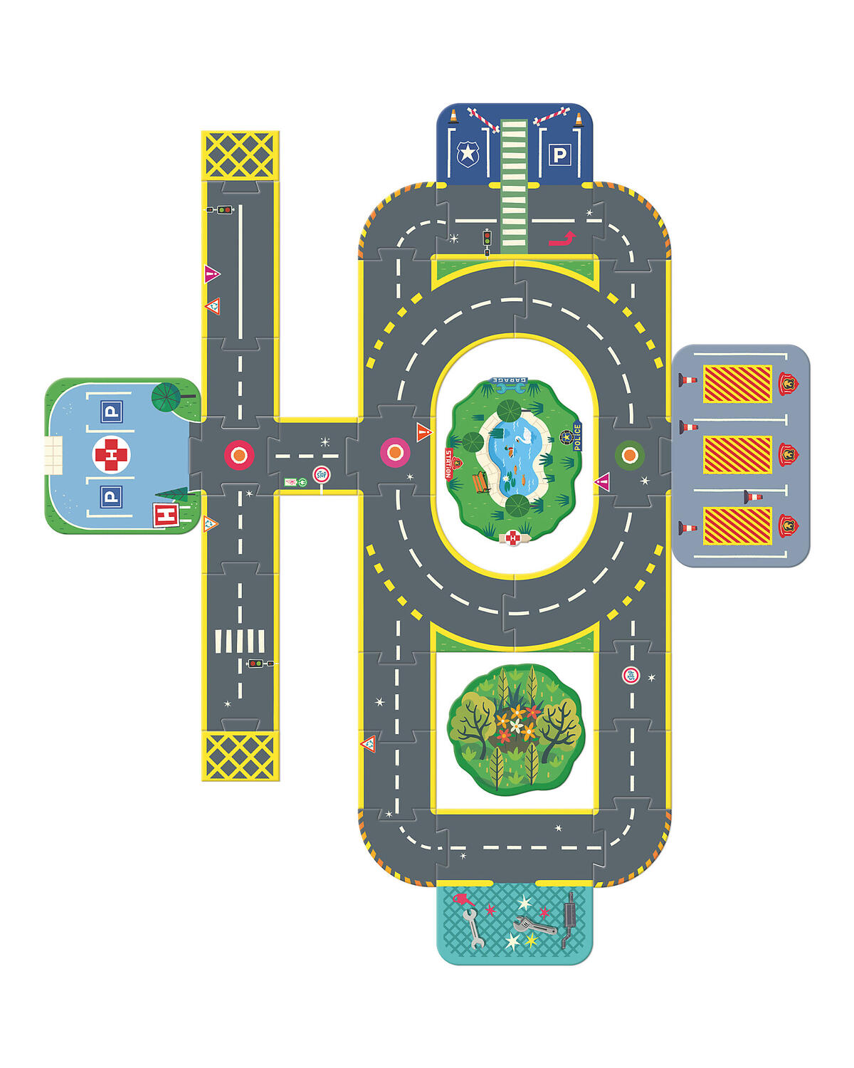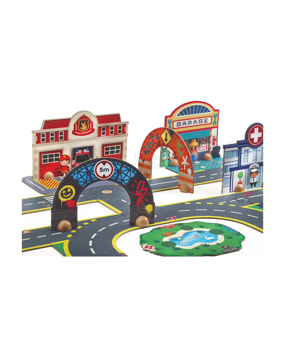 Crea la tua città gigante Crazy composta da 28 pezzi di pavimento e 6 elementi scenici: un ospedale, una stazione di polizia, un garage, una caserma dei pompieri e due archi. Puoi assemblare la città seguendo i modelli suggeriti o dare libero sfogo alla fantasia, inventando avventure uniche.