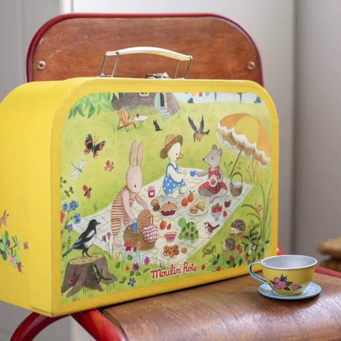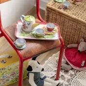 Include un vassoio, una teiera, quattro piatti da dessert, quattro tazze e i loro piattini assortiti.