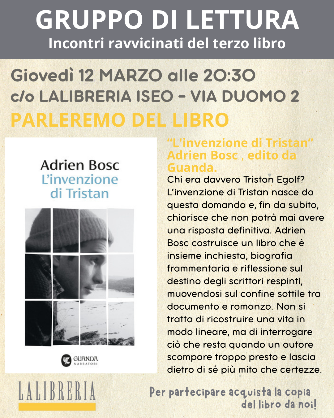 Per partecipare al nostro gruppo di lettura basterà acquistare la copia del libro da noi e venire.